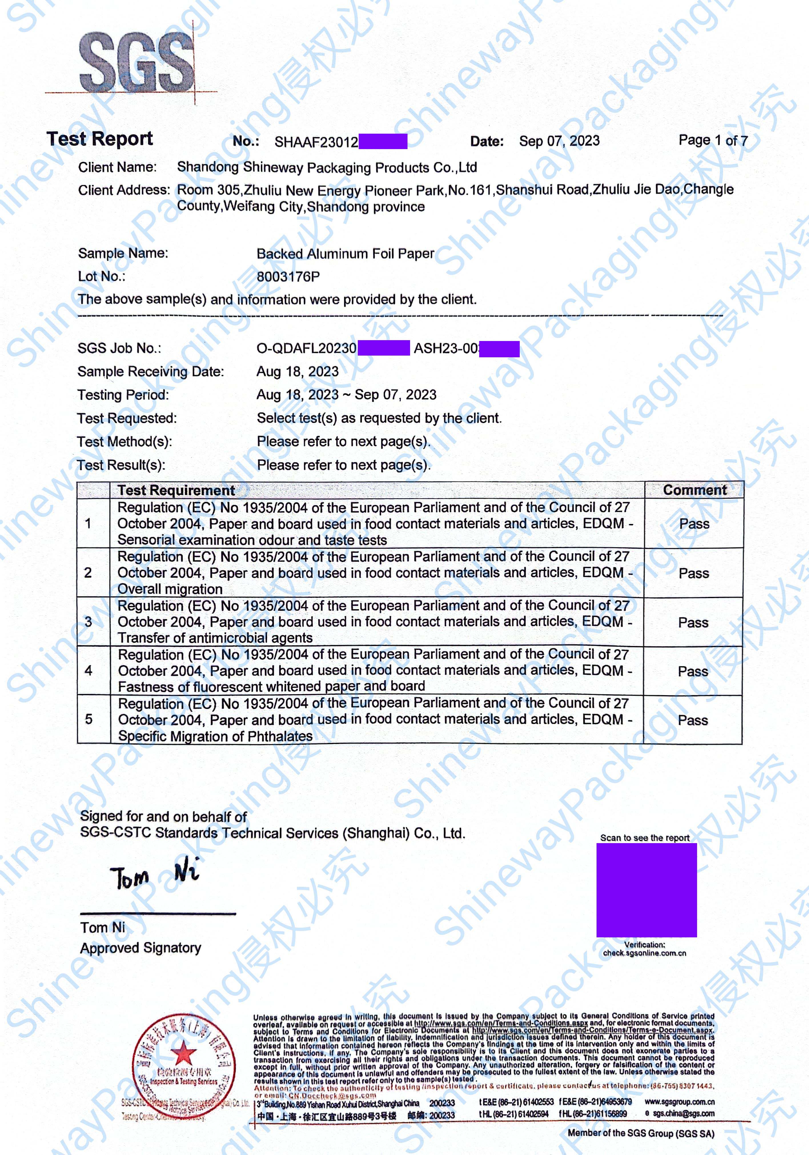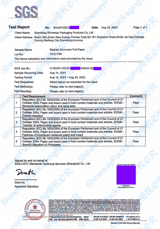 Informe de pruebas de SGS para papel de embalaje de papel de aluminio con respaldo, el material es de calidad alimentaria y pasa las pruebas de migración.